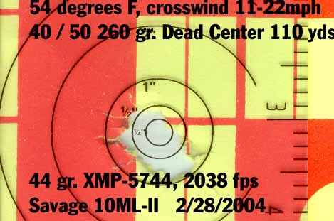 Those electing to use non-smokeless powder will find 110 to 115 grains of Hodgdon Triple Seven FFg a formidable combination with the 240 gr. .40 / 50 Dead Centers. While losing the maintenance free and low cost per shot features of Accurate Arms 5744, and the inability to fire 300 gr. class projectiles at 2100 fps, the 240 Dead Centers / Triple Seven combination is still a 200 yard MPBR load, and a sub-1” accurate load in my test gun. The notion that Triple Seven or Pyrodex is more erosive to Savage vent-liners than smokeless powder is completely wrong. If anything, it is less erosive—with 400 shots giving no visible change in accuracy. Immediate cleaning after shooting T 7 or Pyrodex remains mandatory, however.PRIMERS: Federal 209A shotshell primers remain the preferred 209 primer in all my in-line firearms, still completely misfire-free, and offering a “free” velocity increase of 30 to 40 fps when used with Accurate Arms 5744 when compared to other brands of primers."